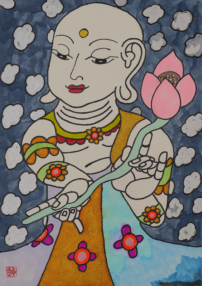昭和57年生。北九州市在住。自閉症のため人と話せず、難病で視野の96%を失うが、神仏を主なテーマに絵を描く。